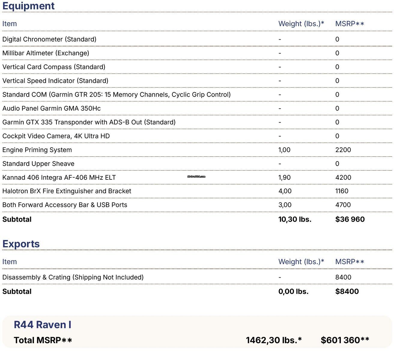 | Übersicht | | Typ: | Helikopter (Kolbenmotor) | | Hersteller: | Robinson | | Modell: | R44 | | Baujahr: | 2023 | | RegistrierungsNr.: | SP-HPF | | Serien-Nr.: | 2731 | | Standort: | Polen | | Gesamtzeit (TTAF): | 1300 h | | Preis: | US$ 400'000 (~ CHF 319'041) |