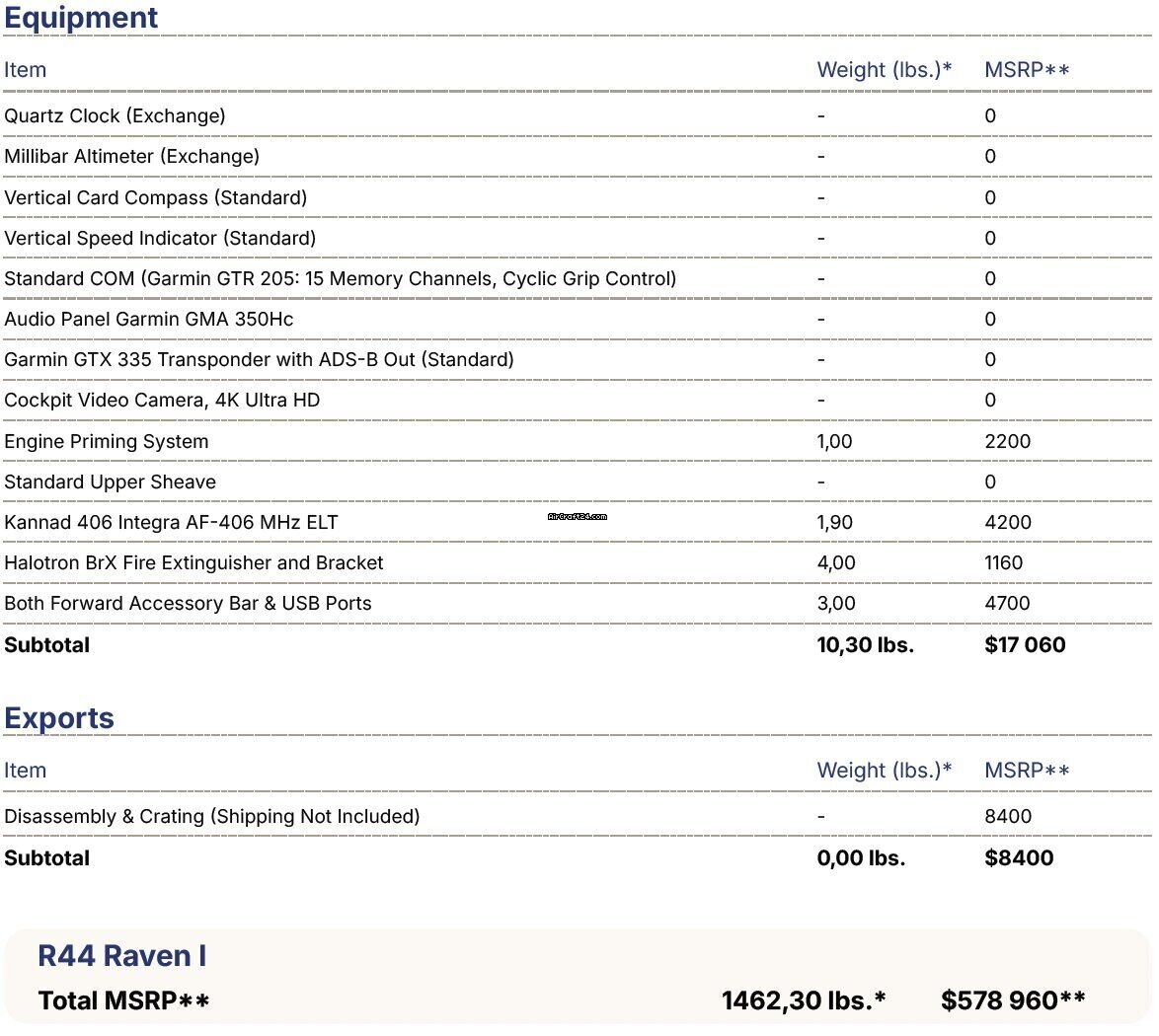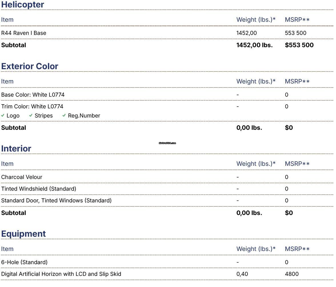 | Übersicht | | Typ: | Helikopter (Kolbenmotor) | | Hersteller: | Robinson | | Modell: | R44 | | Baujahr: | 2023 | | RegistrierungsNr.: | SP-SOW | | Serien-Nr.: | 2766 | | Standort: | Polen | | Gesamtzeit (TTAF): | 1700 h | | Preis: | US$ 360'000 (~ CHF 287'137) |